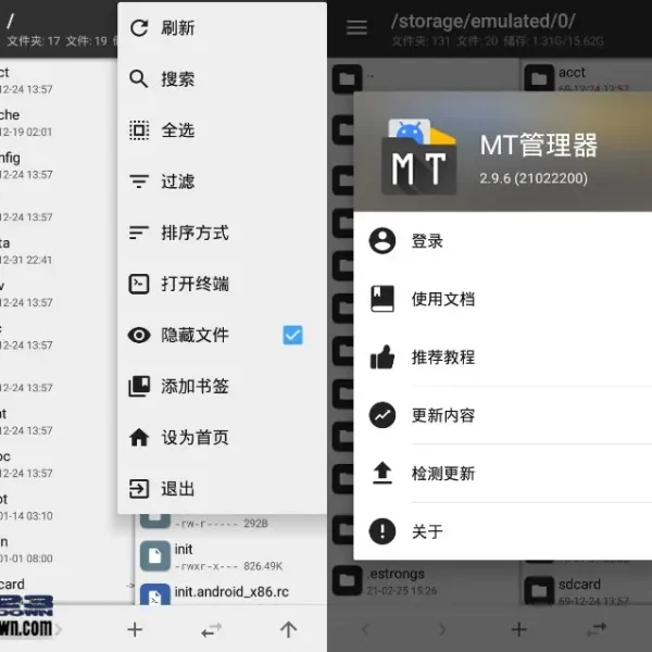 – 文件复制、移动、创建软链接、重命名、删除、创建文件(夹),文件批量操作。获取 Root 权限后可访问系统目录,挂载文件系统为读写,修改文件权限和所有者。