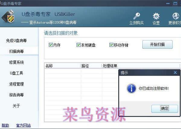 此特别版由 zd423 破解,启动即为已注册版,可以免费使用杀毒和升级数据库等全部功能。USBKiller,U盘杀毒专家,界面简洁,功能很多,扫描U盘病毒、系统内存,本地硬盘,移动设备,相当于一个小型杀毒软件!还拥有后台自动工作能力,占系统资源极少,不仅可以扫描病毒还可修复系统。