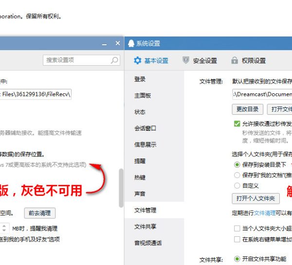解除设置->文件管理->选择个人文件夹(消息记录等数据)的保存位置->保存到安装目录下 的系统限制