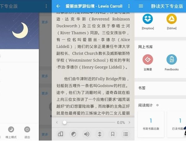 静读天下app(Moon+ Reader)是一款安卓小说软件专业的电子阅读器.Google Play商店排名第一的小说阅读器,静读天下专业版支持在线书库和本地阅读,文字转语音,给你仿真阅读体验.全新书架,图书搜索,夜间主题,阅读历史,新统计功能;书籍信息摘要/笔记导出,添加启动桌面最喜爱的小挂件,支持长书名,最喜爱的图书.