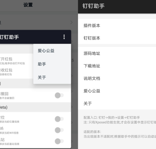 Xposed模块#钉钉助手是一个非常好用的钉钉安卓版的辅助插件,这款Xposed插件主要用于:钉钉抢红包、钉钉消息防撤回、钉钉虚拟定位打卡功能,这是钉钉助手最新版本,新增自动适配虚拟WiFi与基站。
