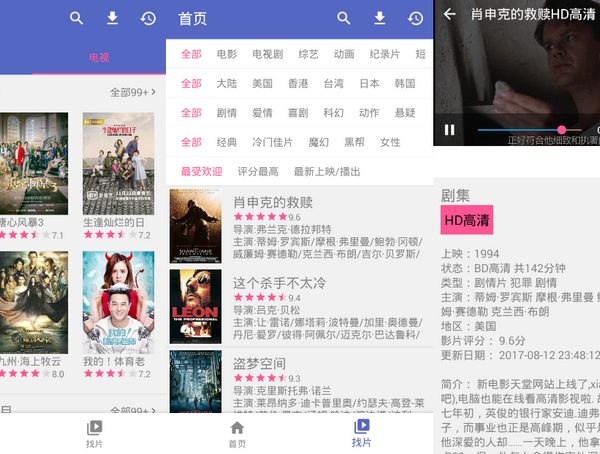 这是电影天堂安卓客户端的简约版,全新改变,全新应用图标,更纯粹的界面设计,可以在线免费观看及下载影视,采集了豆瓣影视内容,包含最新/热门/评分最高/最受欢迎/排行榜,几乎全部为HD高清影视,有些甚至是各大平台的VIP影视,播放过程可以切换其它视频平台的线路,播放非常流畅,下载速度也还可以。