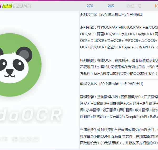 PandaOCR(又称熊猫OCR)是一款个人开发的免费多功能OCR图文识别软件,堪称最强OCR工具。提供大量识别引擎、翻译引擎、朗读引擎、公式识别、表格识别、多规则截图识别等全功能,支持高分辨率屏幕。