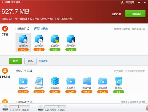 金山毒霸的垃圾清理工具,短小精悍,有着绚丽的界面,无论是启动画面还是扫描界面,设计得都是大气有档次,而且还有着和界面一样强大的功能,不失为国产清理软件中的精品,极炫垃圾清理,就要爽的感觉!