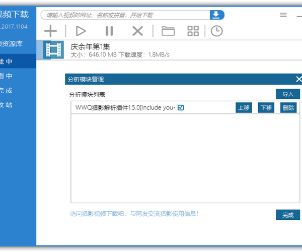 猎影视频下载-》主菜单-》解析模块管理-》分析导入插件