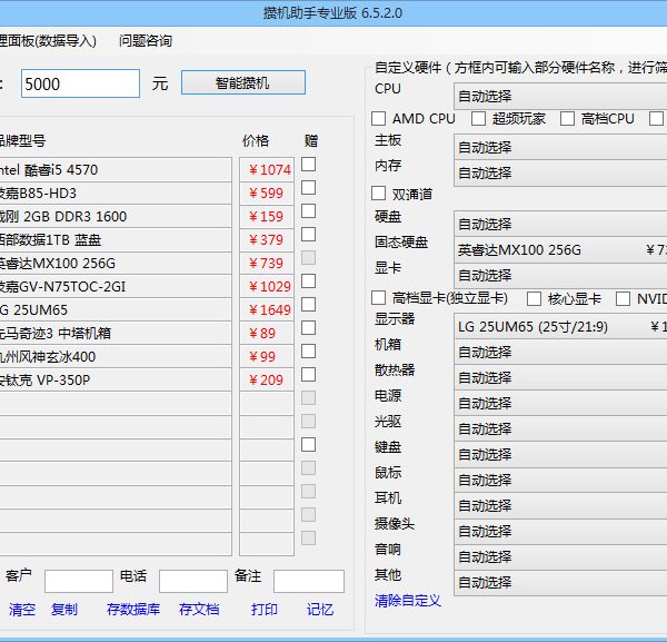 攒机助手是一款自动模拟攒机软件,收录了当下热门硬件型号,可让你对硬件价格有个粗略了解,可根据预算金额选择出最佳的配置单,也可以手动指定某些硬件;专业版有后台管理面板、赠品功能、质保设置;前台可设置客户名称、联系电话、备注等信息,方便为客户打印配置单;还可以将配置单保存到数据库存档;后台管理面板可以实现进价、售价、利润管理,可以方便的编辑配置文件。