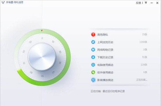 新毒霸隐私清理功能,可以清理“高危隐私”、“上网浏览器历史”、“网络购物记录”、“下载历史记录”、“电脑使用痕迹”和“影音使用痕迹”等。说白了,这隐私清理功能最大的特色,就是能帮你挖掘出暴露你不能说的秘密隐私记录……
